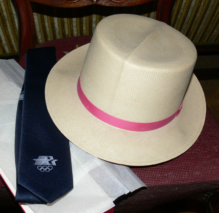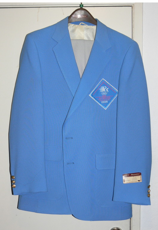 This is an ORIGINAL unused officials uniform for the 1984 Los Angeles Olympic games. Uniform comes with powder blue jacket with breast crest (42R), steel gray slacks (size 36), blue tie with Olympic logo, and straw Panama hat.