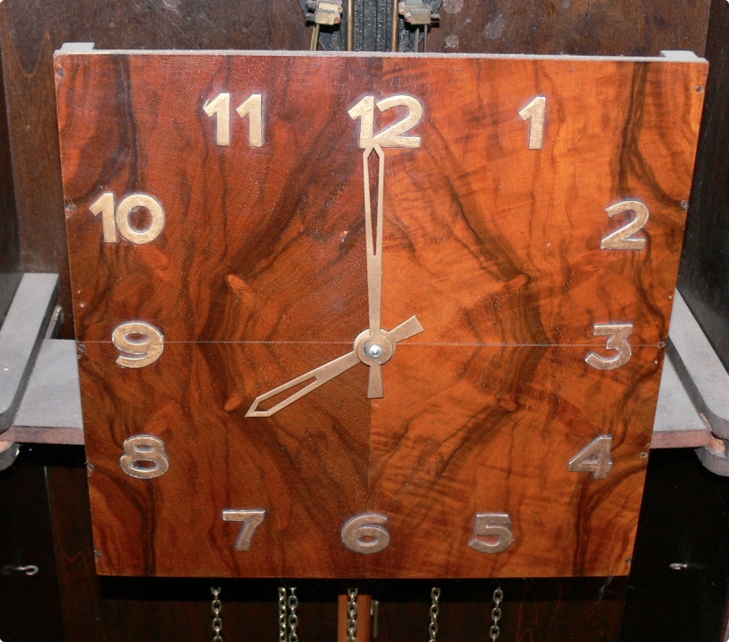 This clock is works beautifully. The new owner may wish to finish the casement. On a scale from 1 to 10, I would rate this a high 6 or 7. The wood has a burl finish, but there are several places where the burl veneer is bubbling and has a ripple appearance, particularly in the upper right side corner. Nothing serious, but if buyer wishes to do so, this could be repaired without extensive effort. Measures approximately 78.5" high x 20.25" wide x 9.5" deep.