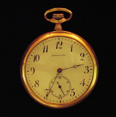 This watch is in absolutely excellent mechanical condition. It has been regularly serviced and keeps perfect time. The watch is 14K gold from Marcus & Co. (a name equal to that of Tiffany) and measures approximately 2” in diameter. Watch case is also in very good condition with only minor surface feathering which can easily be buffed out. It has an engraved presentation which reads, "Presented to David Lawrence for exceptionally valuable services to the Associated Press in connection with the Mexican Revolution,