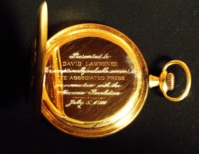 This watch was presented to David Lawrence at an AP dinner in his honor. Mr. Lawrence was the first U.S. reporter to cover the revolutionary uprising in Mexico, and because of his close relationship with Woodrow Wilson, was the President’s unofficial advisor on the burgeoning conflict, (a search online of Mr. Lawrence’s bio makes reference to this presentation watch). David Lawrence - who was one of the most respected and lauded newspaper reporters in the history of U.S. journalism - went on to found the U.S. News, which later became the U.S. News and World Report, and served as its CEO for most of its existence in the 20th century.